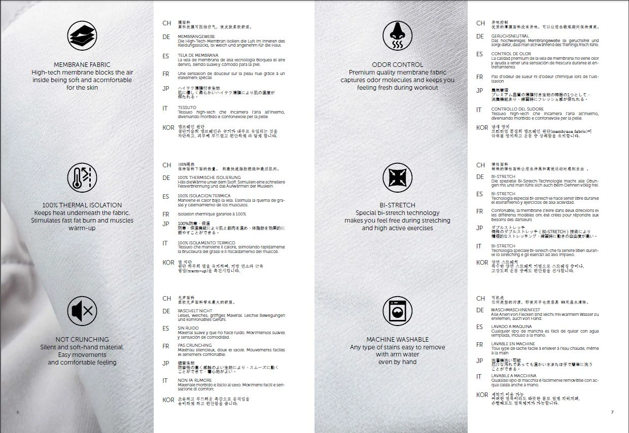 | 100% THERMAL ISOLATION Keeps heat underneath the fabric. Stimulates fast fat burn and muscles warm-up | |