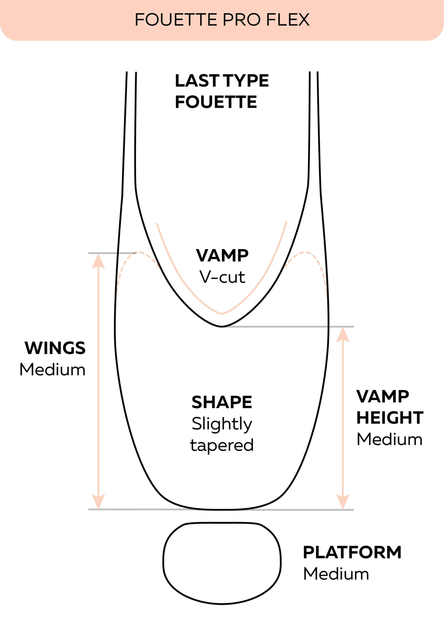 – As the original Fouette model it has V-shaped medium vamp and medium platform. Its perfectly balanced shape creates beautiful foot line.