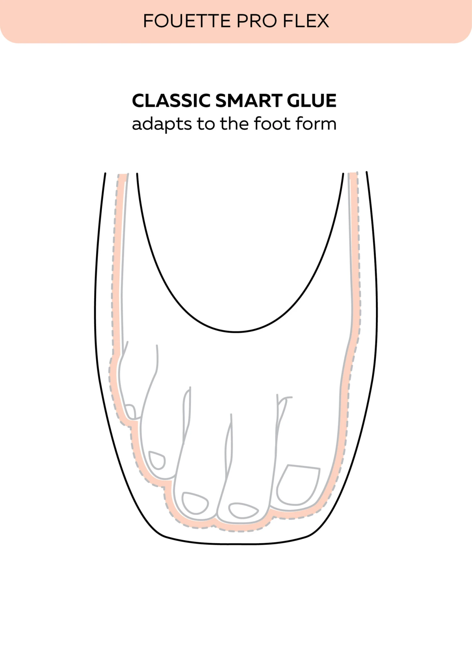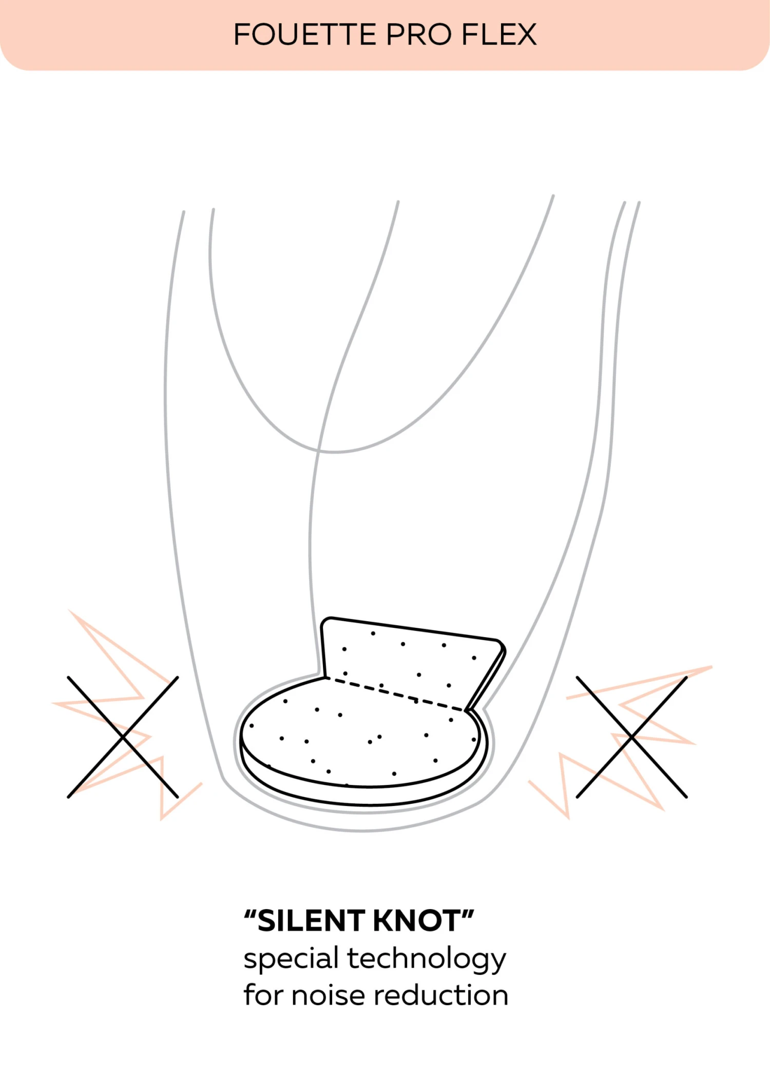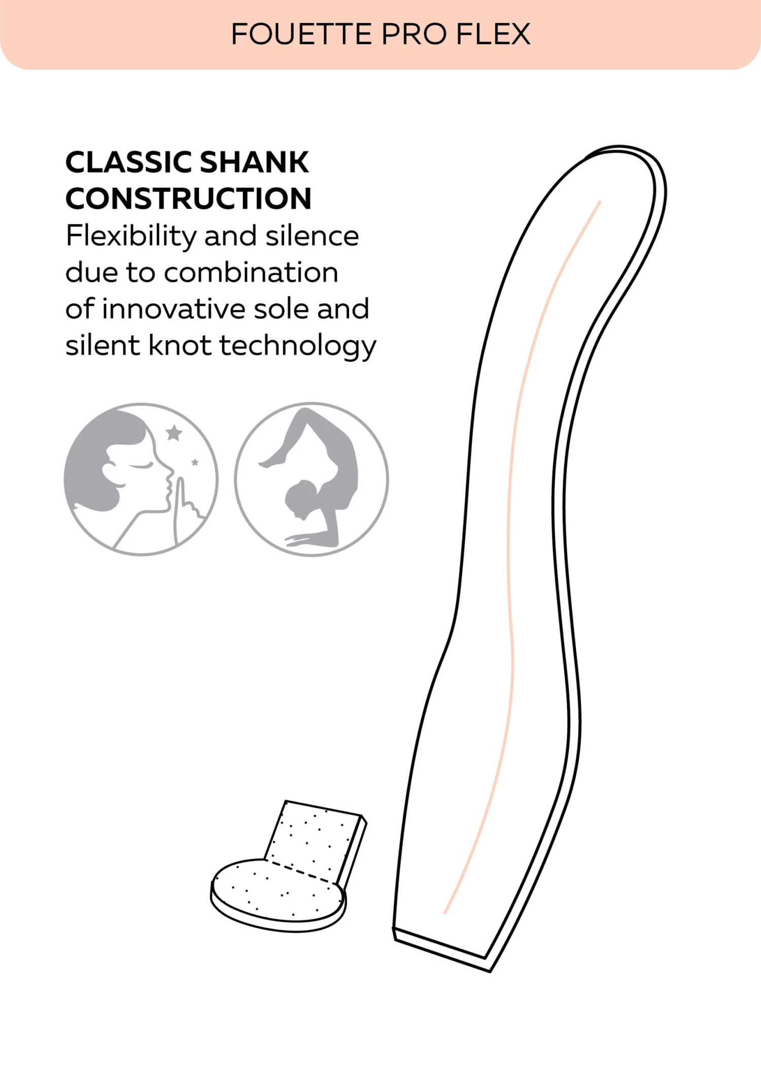 Fouette PRO FLEX fits standard types of feet, and it is specially recommended for performances where “flexibility” and “quietness” are most important and for dancers who like the original «Fouette» model, but want quieter and more flexible shoes.