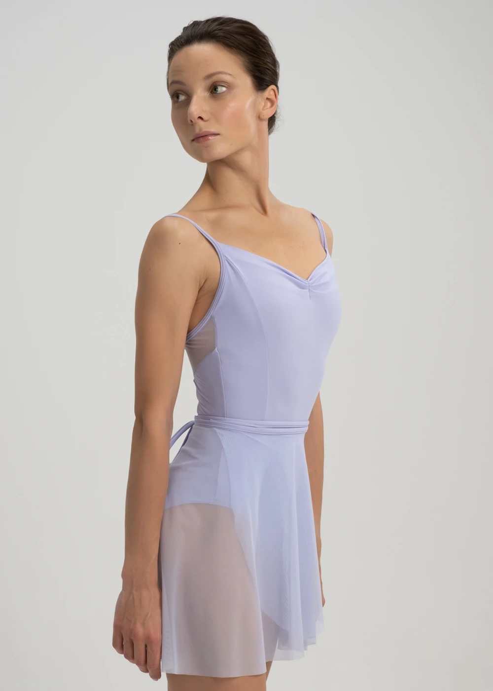 Adjustable camisole leotard with elegant princess seams and mesh back detail in V shape as well as a mixed sweetheart bust line pinch.