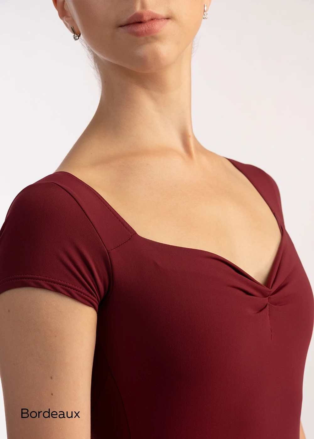 Fixed pinch front with sweetheart neckline, double V back cut. Cap sleeve leotard with adjustable hip line. Lining includes a removable bra cup pocket.