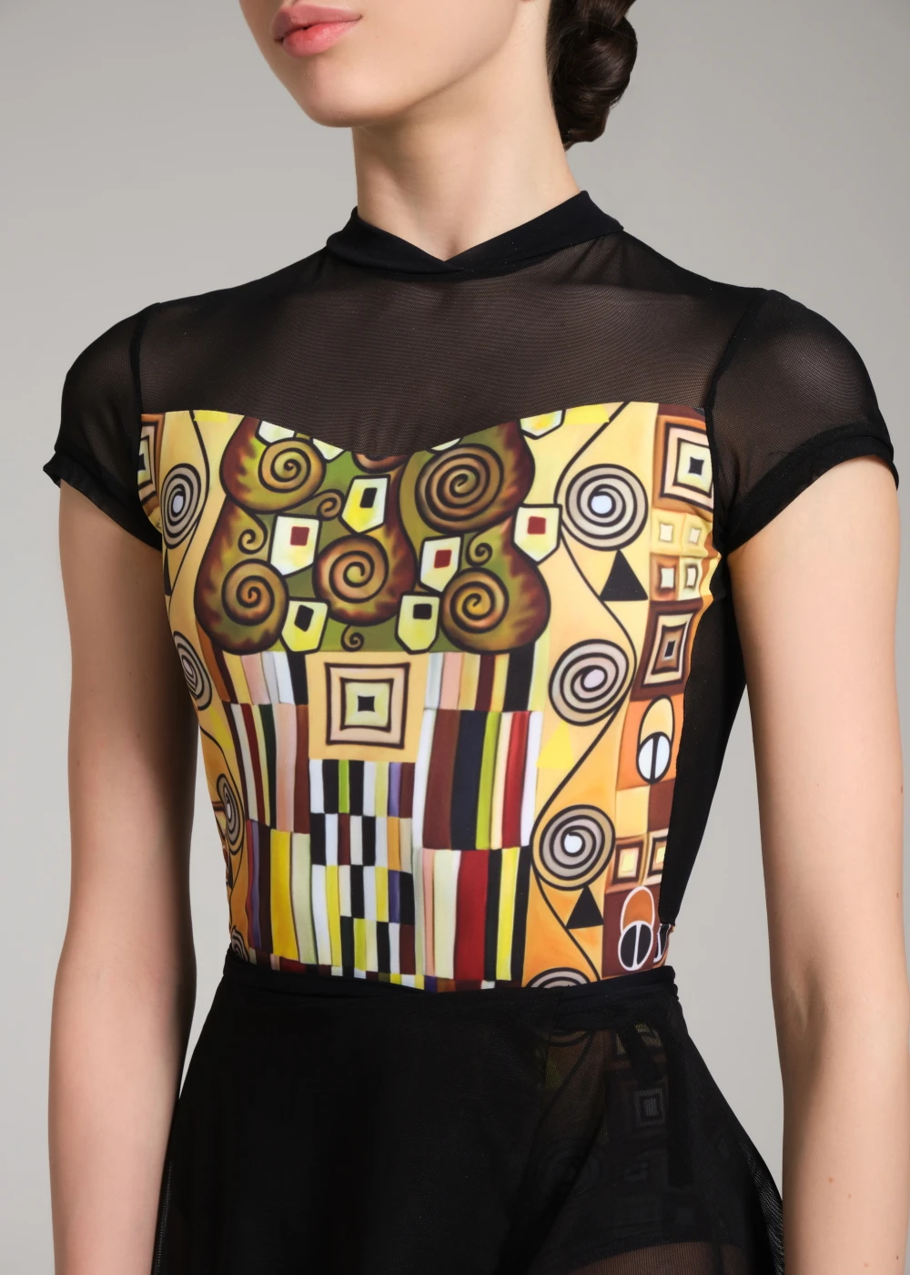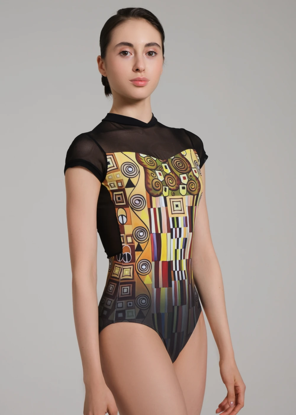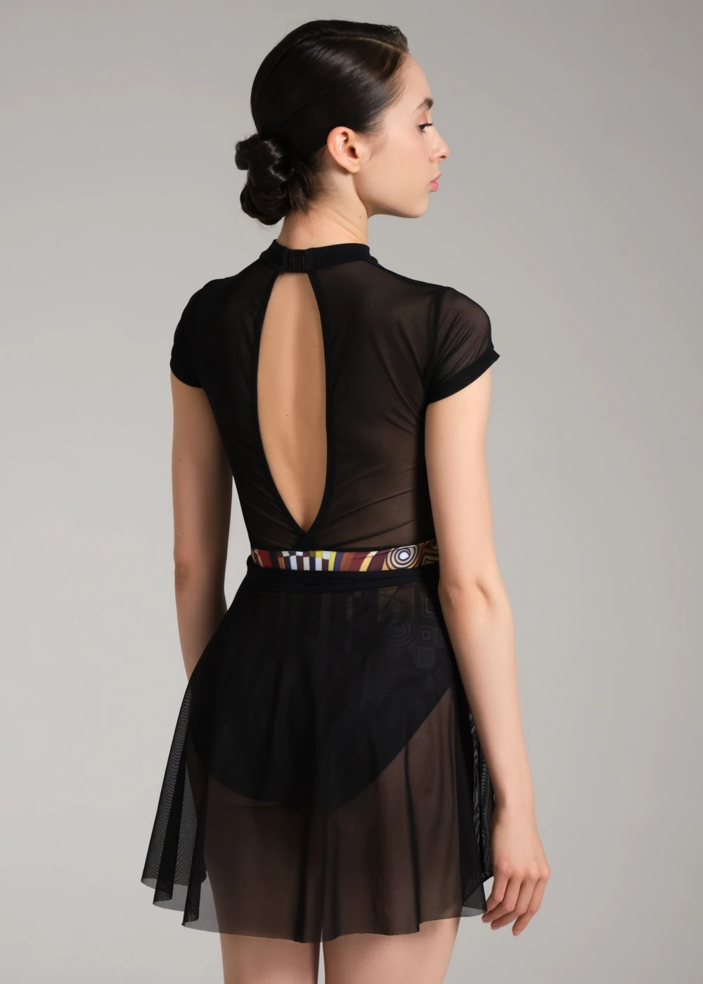 Tank style leotard worthy of a diva. Sweetheart neckline with mock turtle neck and cap sleeves. Beautiful mesh over-cross on lower back. Highest quality Italian materials. Fully front lined. Bra cup pockets.