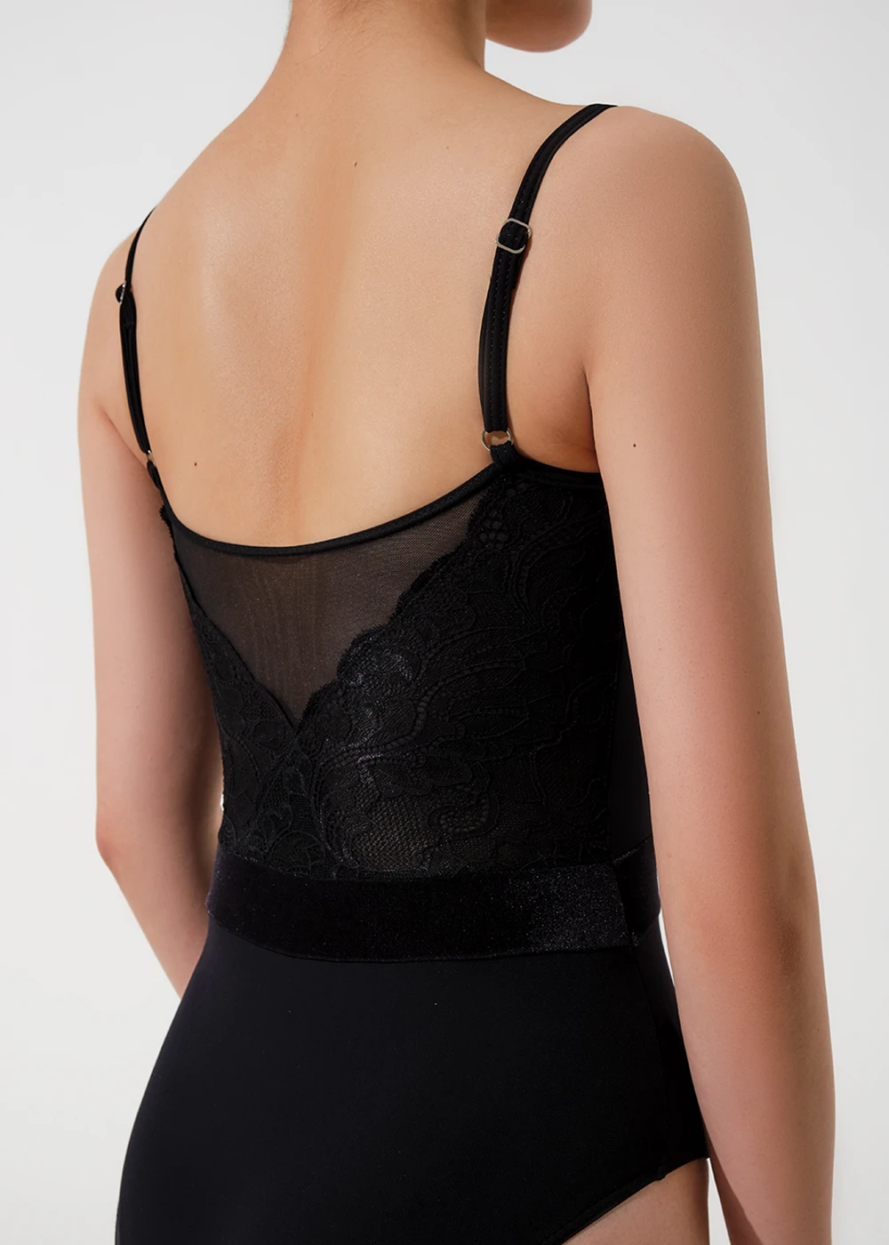 Pinch front camisole with adjustable straps. Velvet front trim and wasitline meets at the back to create a v-cut design.