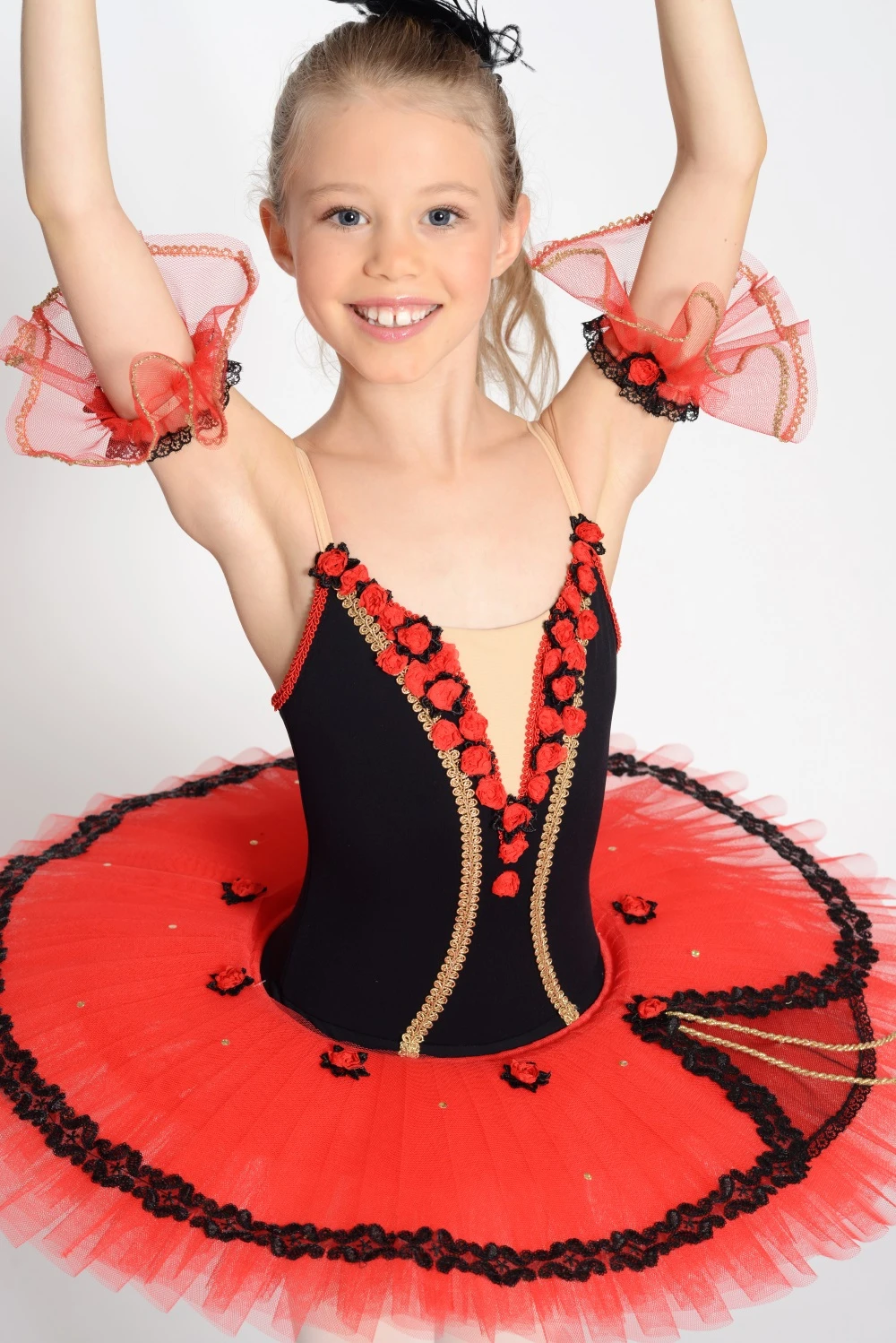 A tulle plate and sleeves are part of the costume.